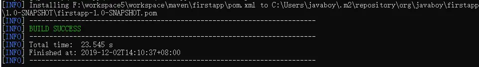 如果需要将项目安装到本地仓库,可以直接执行 mvn install 命令,注意,mvn install 命令会包含上面的 mvn package 过程。