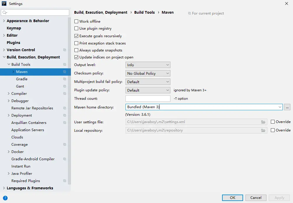 IDEA 中,Maven 的配置在 File->Settings->Build,Execution,Deployment->Build Tools->Maven: