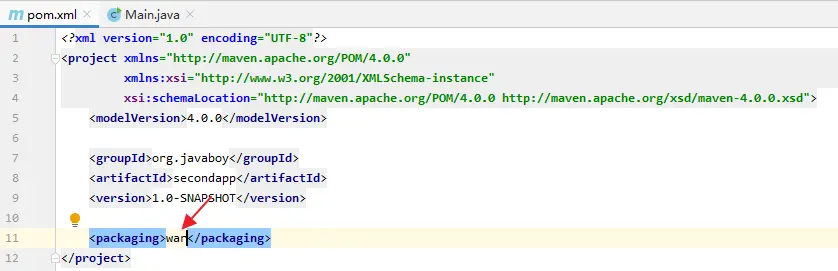 项目创建完成后,首先修改 pom.xml ,配置项目的打包格式为 war 包。 这样,IDEA 就知道当前项目是一个 Web 项目: