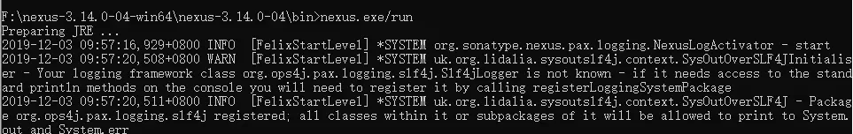 解压之后,打开 cmd 窗口(以管理员身份打开 cmd 窗口),然后定位了 nexus 解压目录,执行 nexus.exe/run 命令启动服务。