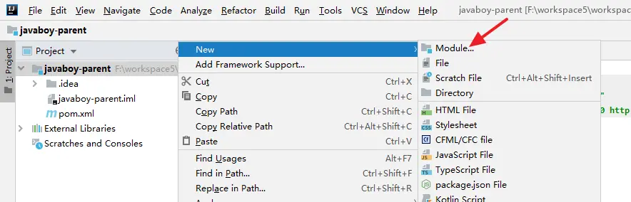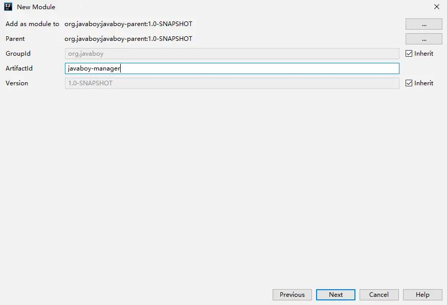 4.选中 javaboy-manager,右键单击,New->Module 创建一个新的 Maven 模块出来。这个步骤类似于第二步,不在赘述。 这里,新的 javaboy-manager-model 创建成功后,我们手动配置它的 packaging 属性值为 jar。