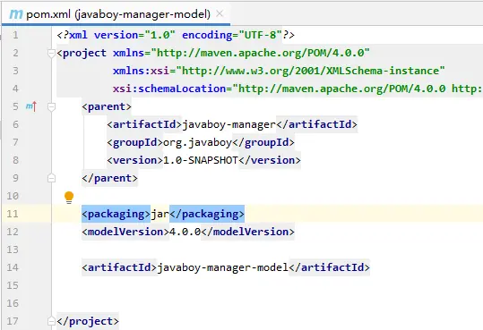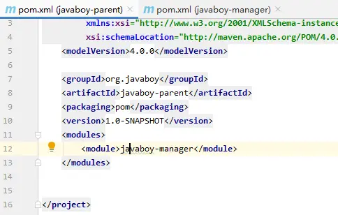 javaboy-manager 创建完成后,此时,观察 javaboy-parent 的 pom.xml 文件,发现它自动加上了 packing 属性: