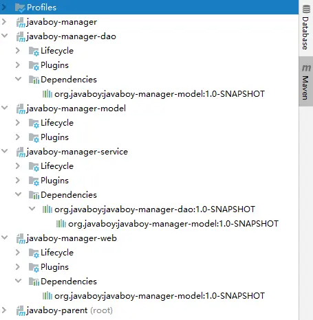 javaboy-manager-web 依赖 javaboy-manager-service javaboy-manager-service 依赖 javaboy-manager-dao javaboy-manager-dao 依赖 javaboy-manager-model