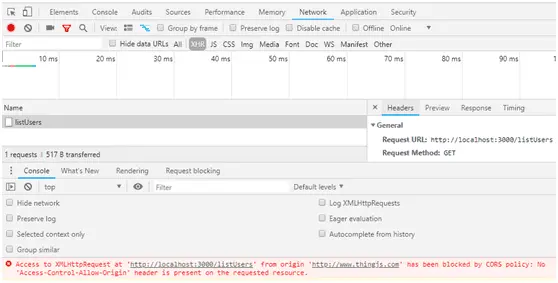 在开发工具 Network 中可查看请求情况,下图展示了跨域相关报错: