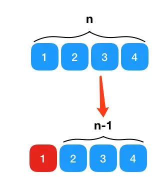乍一看确实看不出什么所以然出来,那我们假设第一个数字已经选中了(假定为1),问题是不是转化为只求后面三位数的全排列了,发现没有,此时全排列从前面 n 位数的全排列转化成了求之后 n-1 位数的全排列了,问题从 n 变成了 n-1,规模变小了!而且变小的子问题与原问题具有相同的解决思路,都是从求某位开始的全排列!符合递归的条件!
