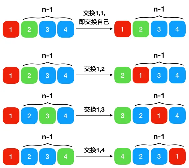 即在第一位上把所有的数字都选一遍,怎么做才能把所有的数字都在第一位上都选一遍呢,把第一位与其他 n-1 位数分别交换即可(注意每一次交换前都要保证是原始顺序),如下