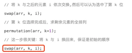 所以最后一个 swap 要做的事情就是每次交换第一个数字与后面被选中的那个数,做完之后元素的全排列之后,要把数字交换回来,以保证接下来再用第一位与其他位的数字进行交换前是原始的序列,这样才能保证第一位数字与之后的 n-1 个元素依次交换之后都是不重复的。