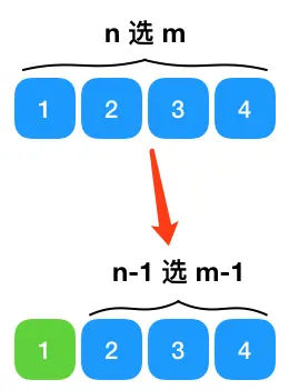 如果第一个元素选中,则要从之后的 n-1 个元素中选择 m-1 个元素