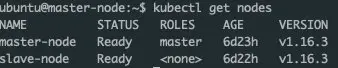 自定义修改了主机名,在之后查看集群内节点时,每个节点的名字就不会显示K8S自动生成的名字,便于查看和记忆。例如,在其他的Node节点你可以将master-node改为slave-node-1或worker-node-2,效果如下。