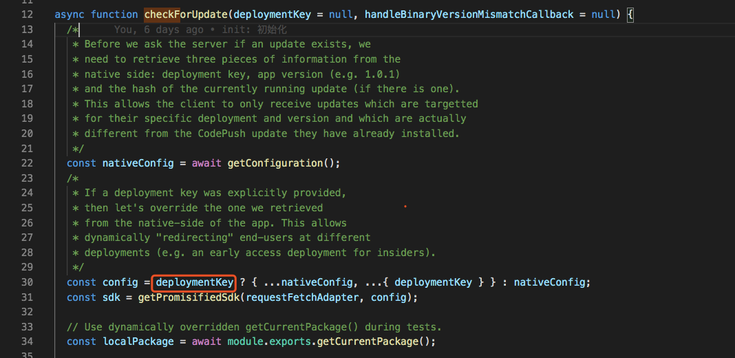 只需要在此处,传入一个 deploymentKey 便会替代 nativeConfig 中的对应字段,所以我们在传入 CodePush 的 config 中传入 deploymentKey 字段即可~。(具体调用流程可仔细阅读集成文档&源码,此处不再详述。如:config 是什么?为什么在config中传入 deploymentKey 此处会生效等?)