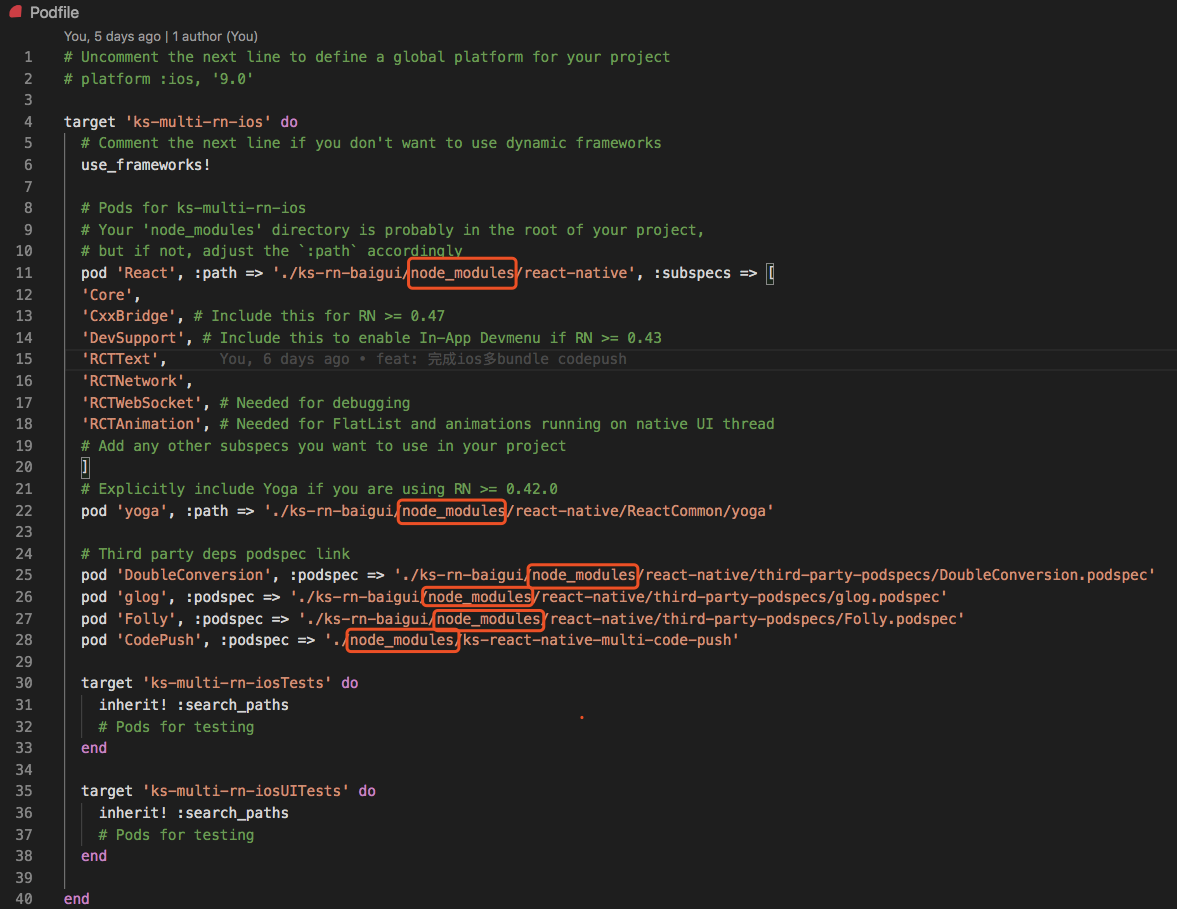 可以看到,其实你在根目录下建什么文件并不重要,ios 真正想要的是你的 node_modules 下的东西,用来做项目依赖。所以正常情况下,只需要你有 package.json,并装好了 node_modules 。接下来仅仅是调整路径的问题。