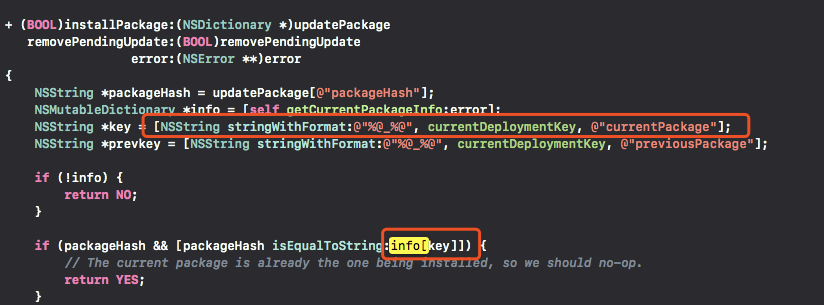 经过对源码进行阅读,最终发现规律,所有进行读写的地方都集中在 CodePushPackage.m 这个文件中,且都有很规整的 info[@"currentPackage"] 或是 info[@"previousPackage"]。这个时候觉得是天助我也,我们只需要在这个常量前面拼对 deploymentKey 就ok了。