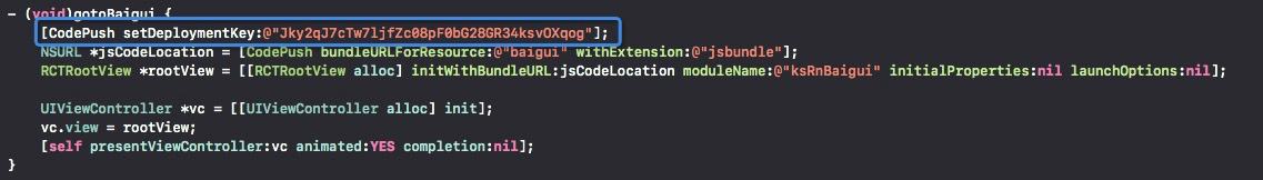 跳转到页面前,调用 [CodePush setDeploymentKey: @"真正的deploymentKey"];