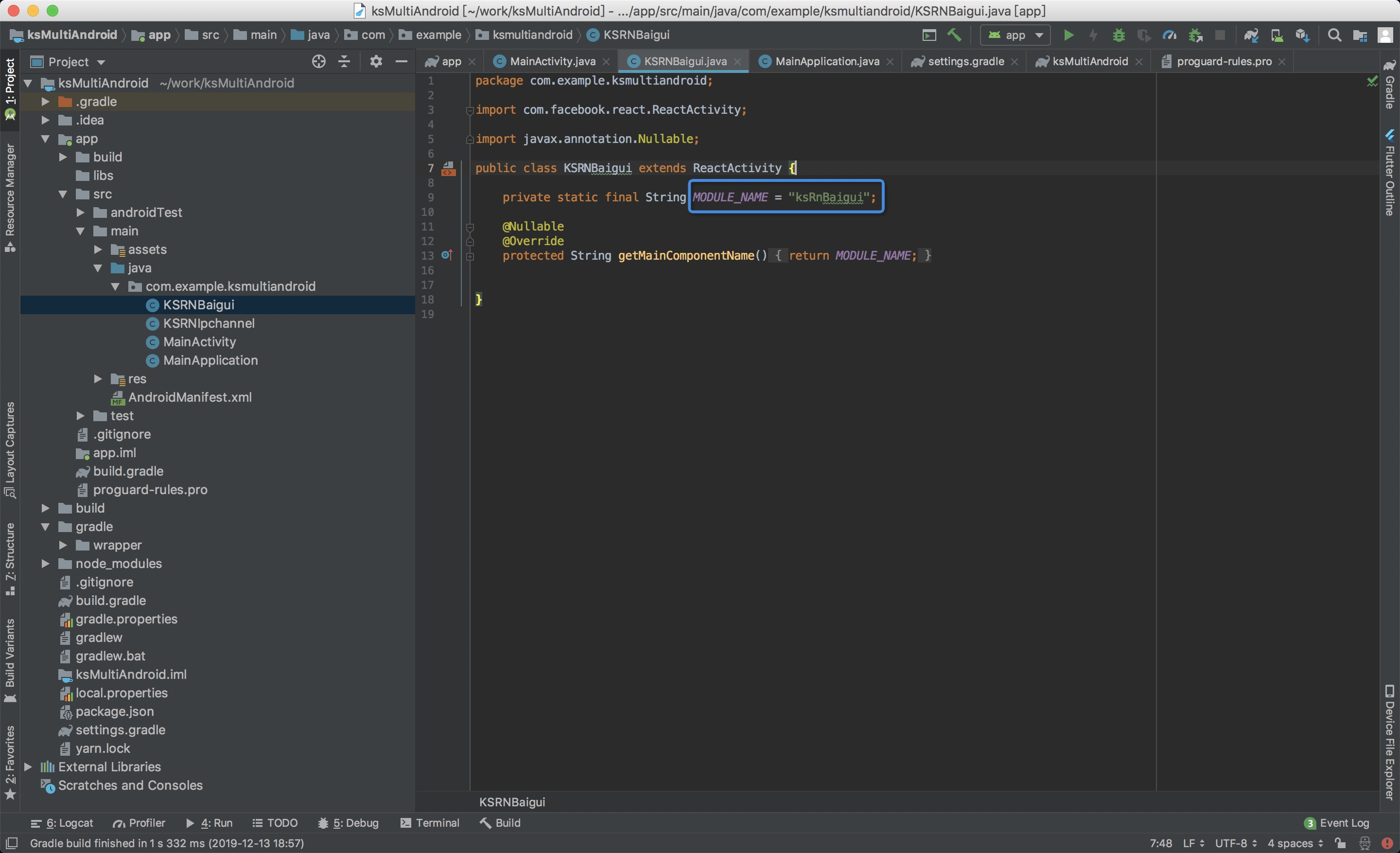 我们需要定义多个 RN 的 Activity文件,拿其中一个举例子。这里的 MODULE_NAME 就是 RN 脚手架生成的项目 app.json 中配置的值。