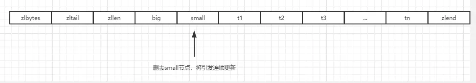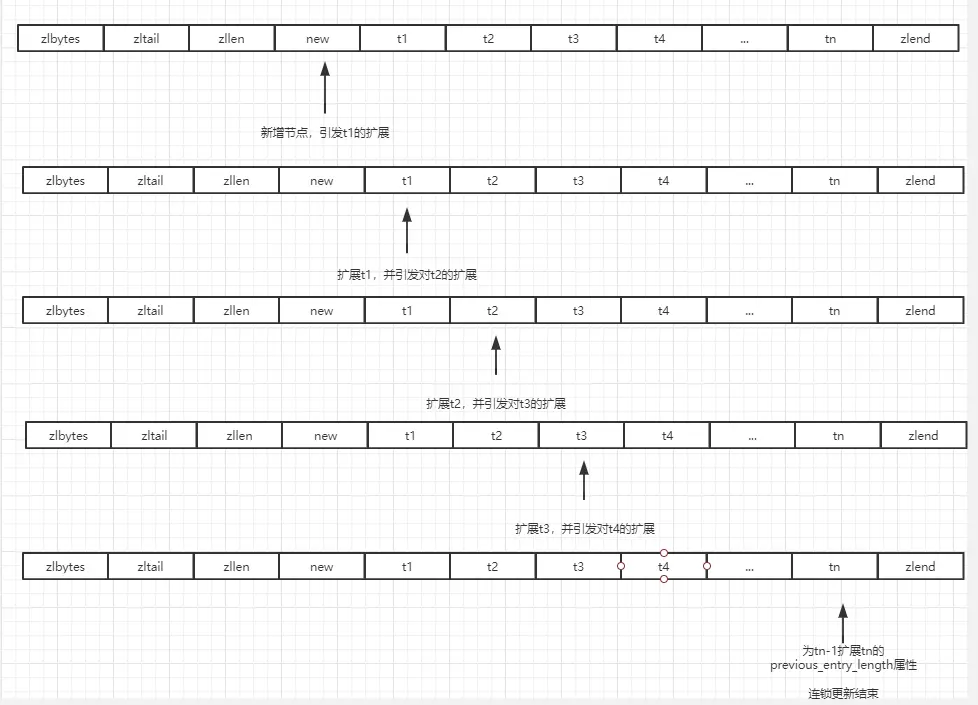 在一个压缩列表中,有多个连续、长度介于250字节到253字节之间的节点,在一个长度大于254的新节点new设置为压缩列表的表头节点,则t1保存这个new节点的previous_entry_length的长度则由1字节变为5字节,则t1节点的长度变为254到257之间,则保存t1长度的t2节点长度也需要修改,依次引起的压缩列表的空间的重新分配,直到最后一个节点为止。