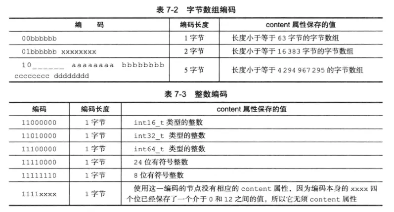 (1)一字节、两字节或者五字节长,值的最高位为00、01或者10的是字节数组编码,表示节点content属性保存着字节数组,数组长度由编码除去最高两位之后的其他位记录。