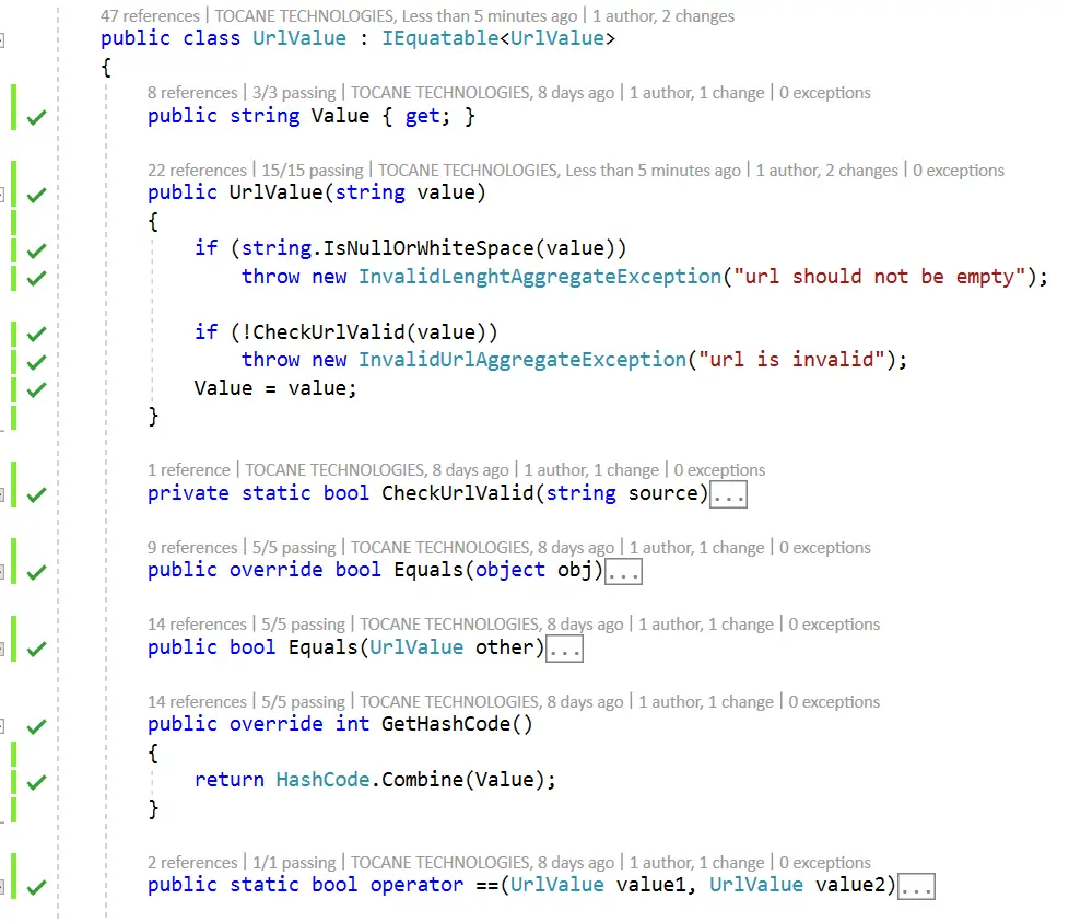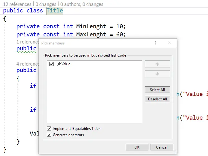让我们修复一下测试。记住一个值对象的判等条件是引用相等或结构相等。在Title类上右键,选择生成Equals与 GetHashCode方法,Title只有一个Value字段,选择它并点击OK。