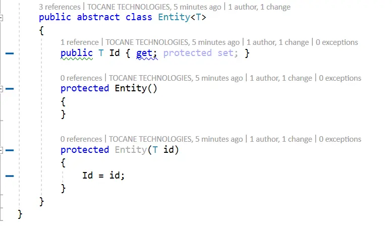 记住实体判等条件是引用相等或Id相等。让我们创建一个实体的基类: Entity,并基于Id生成Equals 与 GetHashCode方法。如果E1,E2有相同的Id,E1==E2就返回true。