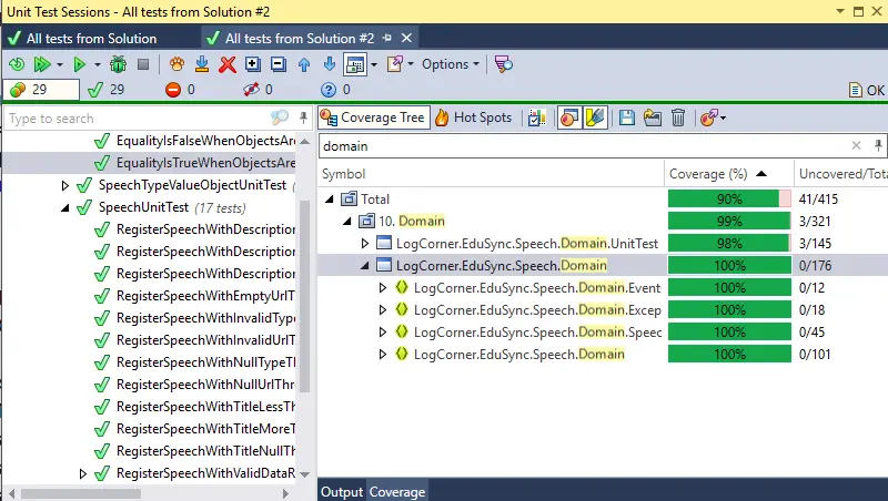 LogCorner.EduSync.Speech.Application 与 LogCorner.EduSync.Speech.Domain 都是100%代码覆盖率。