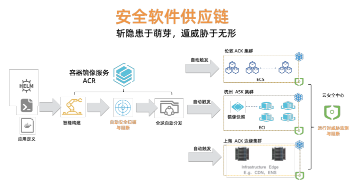 在阿里云上,我们可以便捷地基于容器服务 ACK、容器镜像服务 ACR、云安全中心打造一个完整的安全软件供应链。
