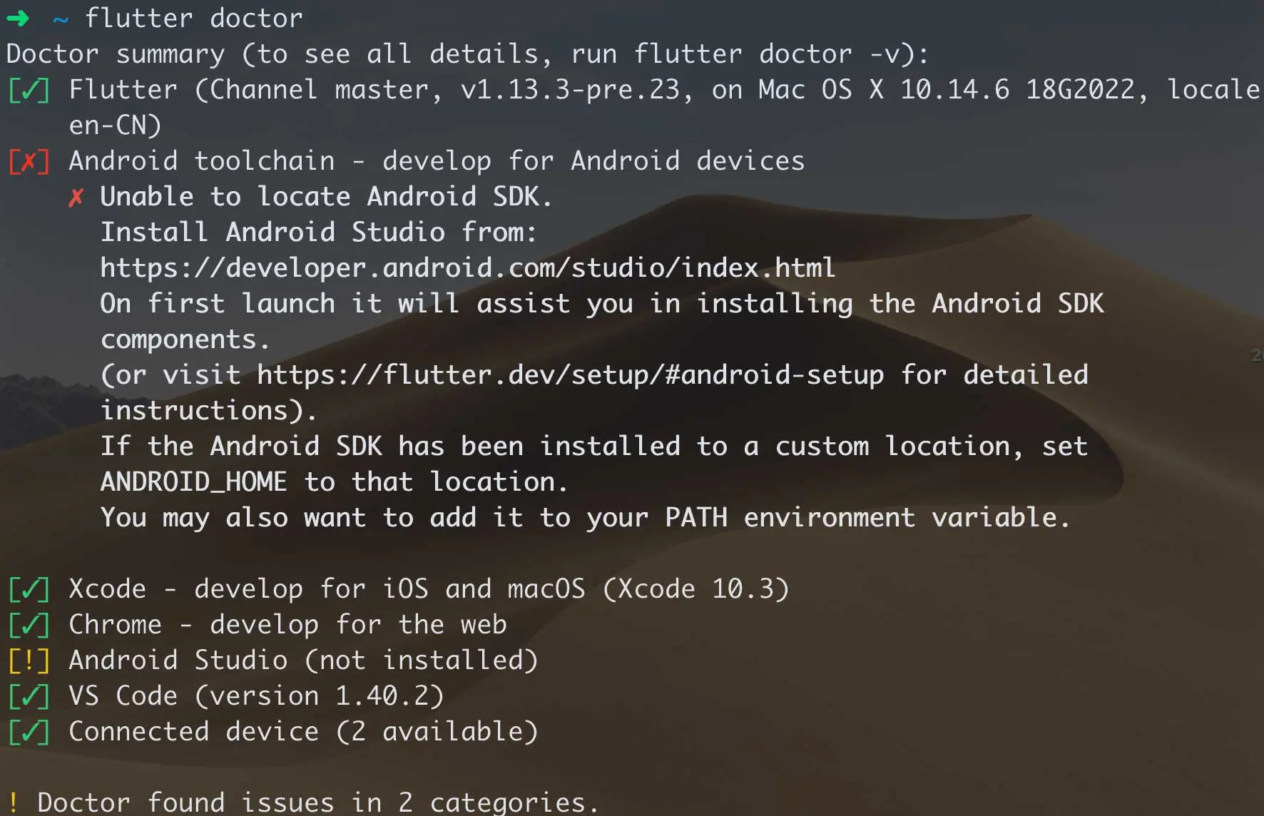 完成这步以后,就算我们flutter SDK的安装工作完成了。可以使用下面命令来检测一下,是否安装成功了。