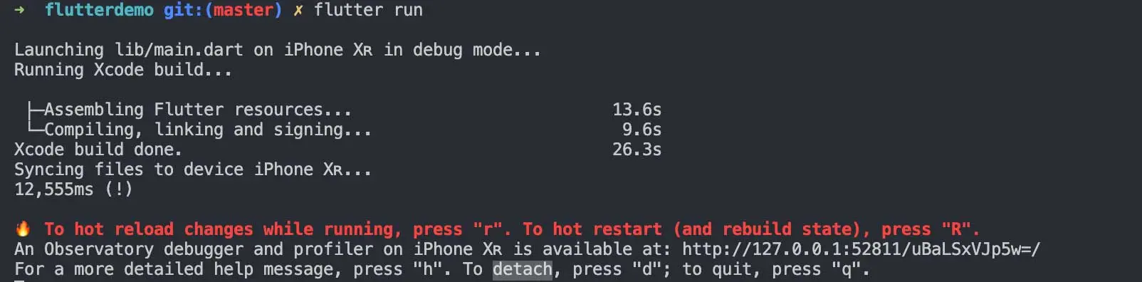 open -a Simulator打开模拟器,然后进入flutter目录里运行flutter run命令,如图所示: