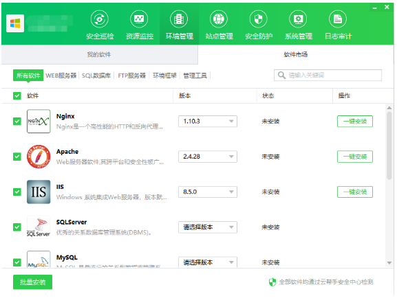 云端统一环境包、应用包管理,保障用户使用的软件安全可靠,丰富的开源集成环境及各种软件插件;如Nginx、php、apahce、SQL多个版本等等。