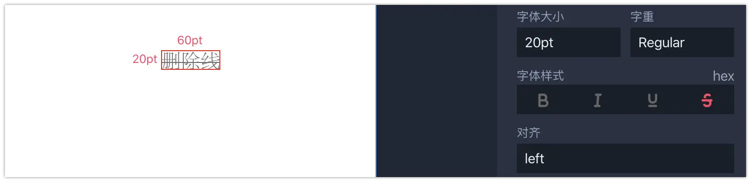 再给大家分享一个小细节:若在设计软件中对字体添加了粗体、斜体、下划线、删除线等样式,上传摹客后会自动识别出该样式,展示在右侧属性“字体样式”中。例如用到删除线的样式,在属性栏中“删除线”的图标就为红色~