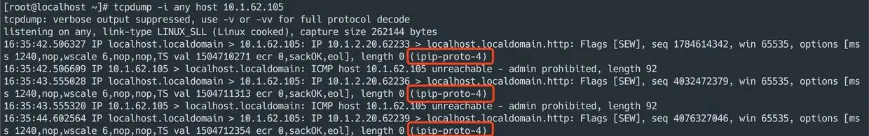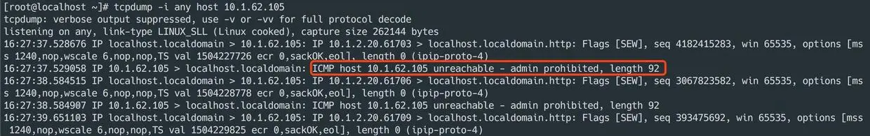 ③ 在DS上使用命令tcpdump -i any host 10.1.62.105截获 RS1 收到和发出的所有数据包(在 Client 依然用老方法循环请求 VIP:PORT ),可以看到 DS 发给 RS1 的数据包被 RS1 用一个协议为 ICMP 的数据包拒绝了。等等,这个数据包的内容咋这么眼熟(ICMP host prohibited),好像用 iptables 查看规则时见过。