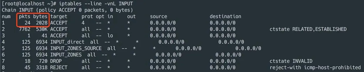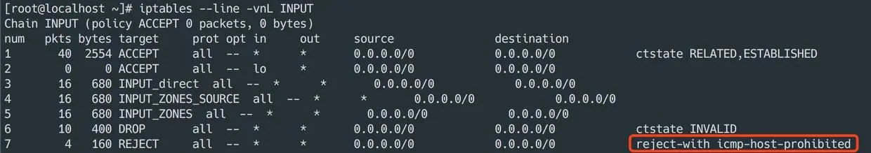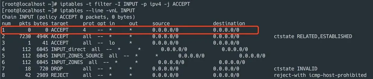 记住一定要在 INPUT 链第七条之前,我这里是直接插入到了第一条,我之前看一篇博文上用的是-A INPUT,这表示 append(追加) 一条规则,会出现在最后,这样设置的规则数据包根本就匹配不到,因为它已经被在你前面的那条REJECT规则匹配并拒绝掉了。