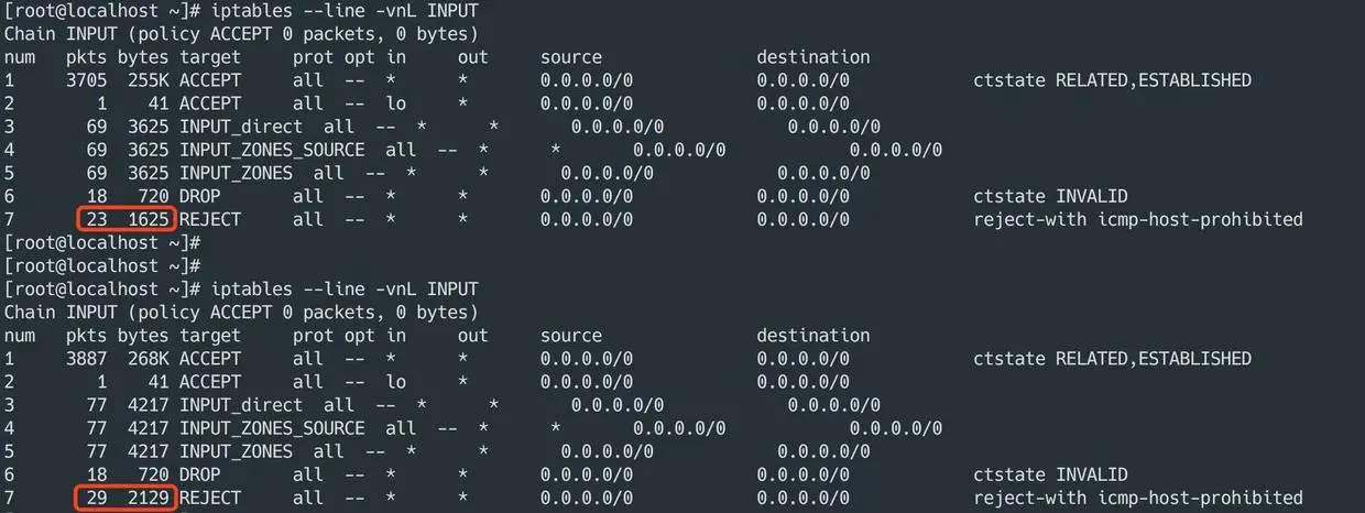 ⑤ 虽然一堆疑问,不过还是先确认下 DS 发给 RS1 的数据包是不是真被第七条规则匹配处理了。这里我采用的方法是,在 Client 端循环请求 VIP:PORT 的前后分别用命令iptables --line -vnL INPUT查看第七条规则的 pkts(该规则匹配到的数据包数量)数值是否发生了变化,果然 pkts 发生了增长,说明数据包真的是被第七条规则匹配到并且 REJECT 掉了。