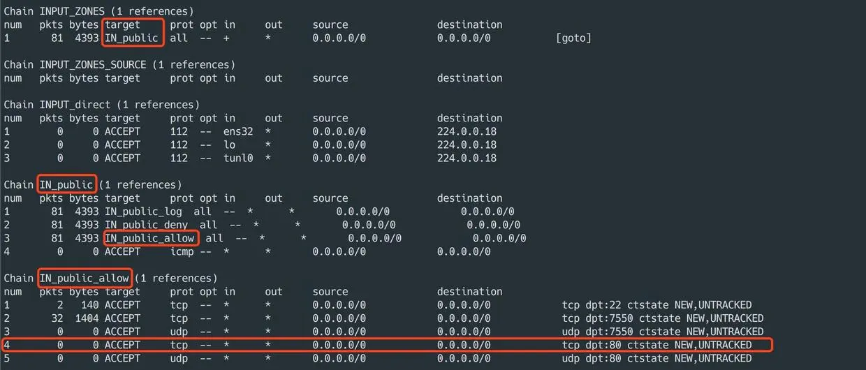 额,我用命令iptables --line -vnL查看了所有 Chain(链) 的规则,找到我开放80端口的那两条规则又确认了一下,发现 dport 是80,协议为 tcp 的那条规则 pkts 一直是0,并没有变化(这条规则在 INPUT 链中是被第五条规则匹配的,规则虽然是在 IN_public_allow 链的,但了解过 iptables 自定义链相关知识后,就会明白这实际上是一个调用链的关系:INPUT_ZONES → IN_public → IN_public_allow,从下图的每个 Chain 的 target 也能看出来)。