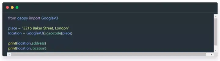 geopy 模块是通过抽象出一系列不同的地理编码服务的 API 来工作。它可以让你获得某一地点的完整街道地址、维度、精度甚至海拔高度。还有一个有用的距离类。它可以使用你喜欢的测量单位来计算两个位置之间的距离。
