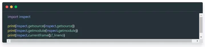 PYthon 的 inspect 模块对于理解幕后发生的事情非常有用。你甚至可以自己调用它的方法!如下所示的代码段,使用了 inspect.getsource() 来打印自己的源代码。它还使用了 inspect.getsource() 来打印定义它的模块。最后一行代码打印出自己的行号。