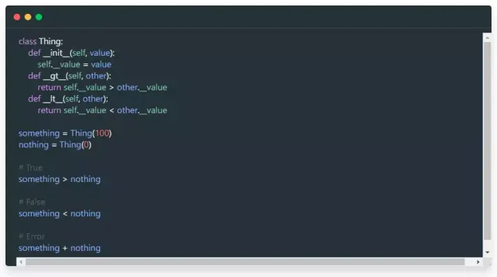 Python 提供了对运算符重载的支持。其实这是一个简单的概念。有没有想过为什么 Python 允许使用 + 运算符来添加数字和连接字符串?这就是运算符重载的功劳。你可以按照自己的特定方式定义使用 Python 标准运算符符号的对象。这样,你就可以在正在使用的对象相关的上下文中使用它们。
