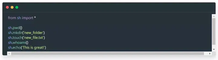 sh 库提供了一个简洁的替代方法。sh 库允许你像普通函数一样调用任何程序,这点对于自动化工作流和任务非常有用,所有这些都来自 Python 内部。