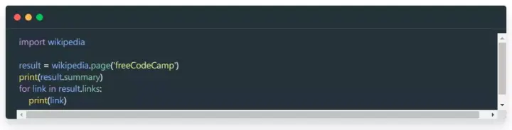 与真实网站一样,该模块支持多种语言、页面消歧、随机页面检索,甚至还有 donate() 方法。