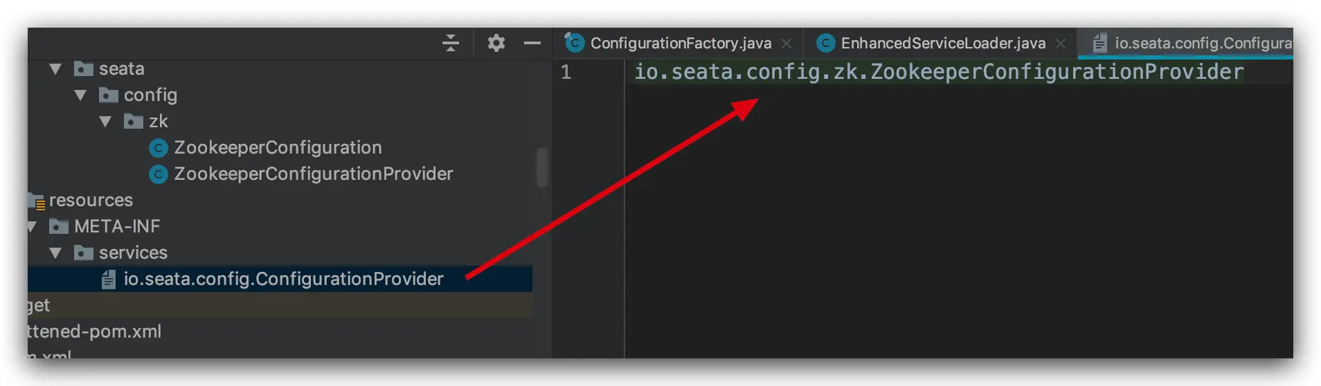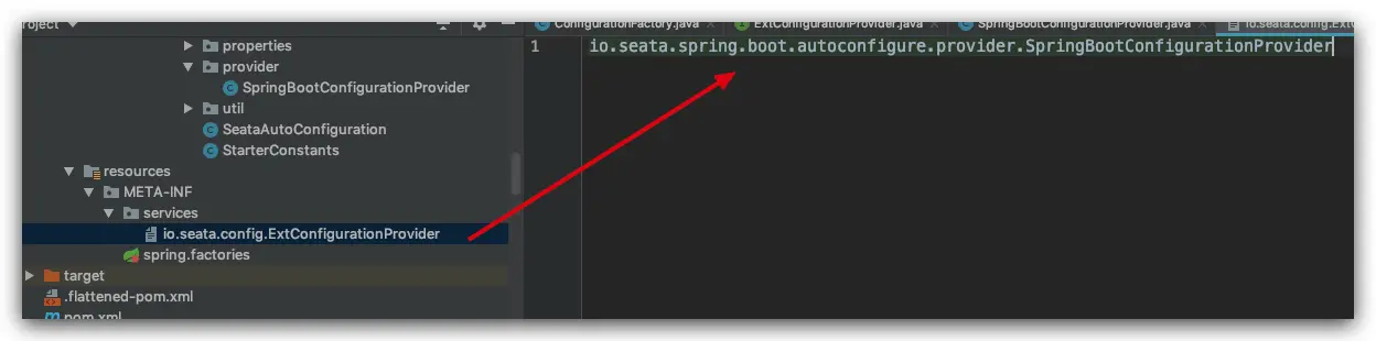 根据自定义文件名配置变量找出配置文件名称与类型,如果没有配置,默认使用 registry.conf,FileConfiguration 是 Seata 默认的配置实现类,如果为默认值,则会更具 registry.conf 配置文件生成 FileConfiguration 默认配置对象,这里也可以利用 SPI 机制支持第三方扩展配置实现,具体实现是继承 ExtConfigurationProvider 接口,在META-INF/services/创建一个文件并填写实现类的全路径名,如下所示: