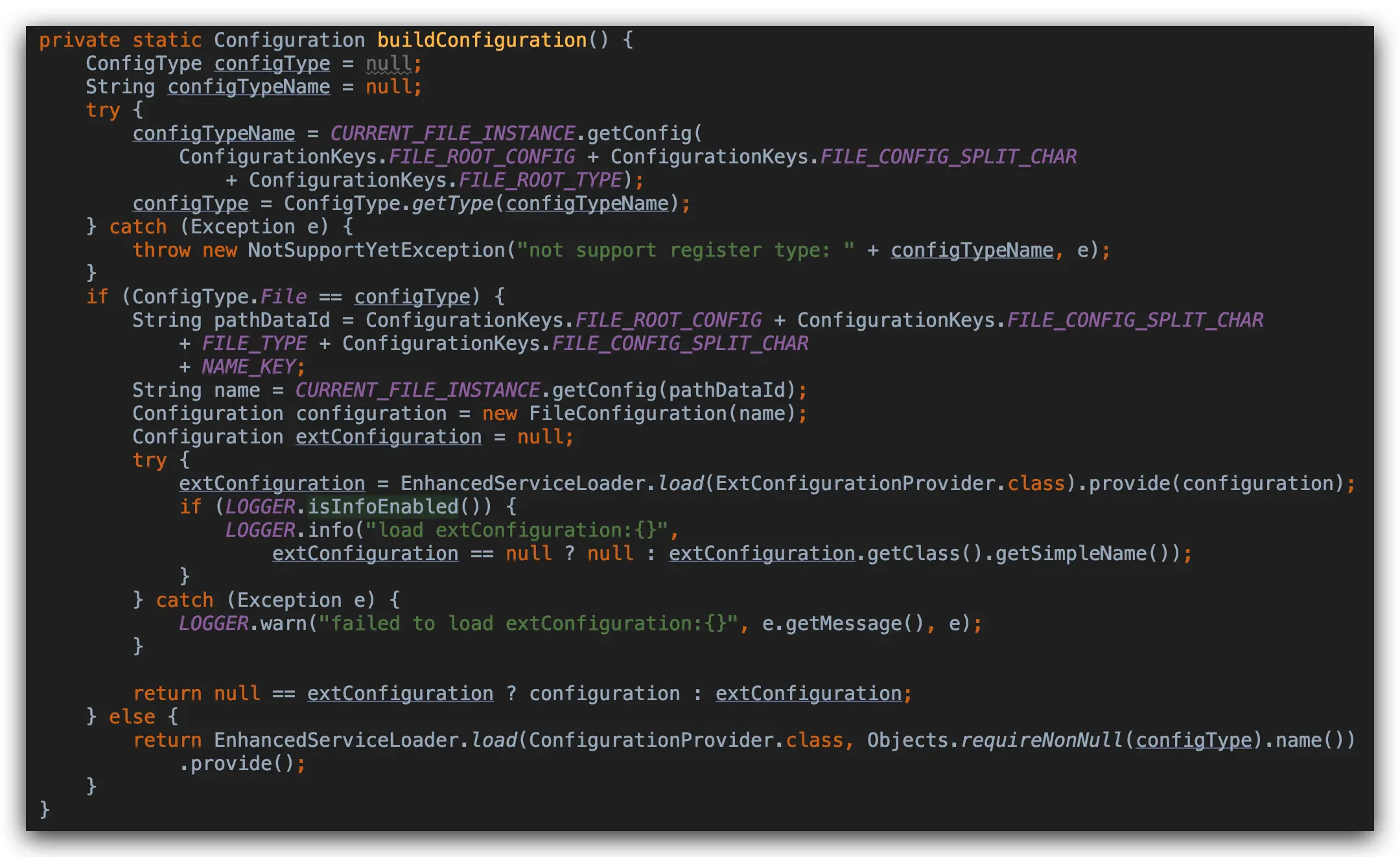 EnhancedServiceLoader.load(ConfigurationProvider.class,Objects.requireNonNull(configType).name()).provide();