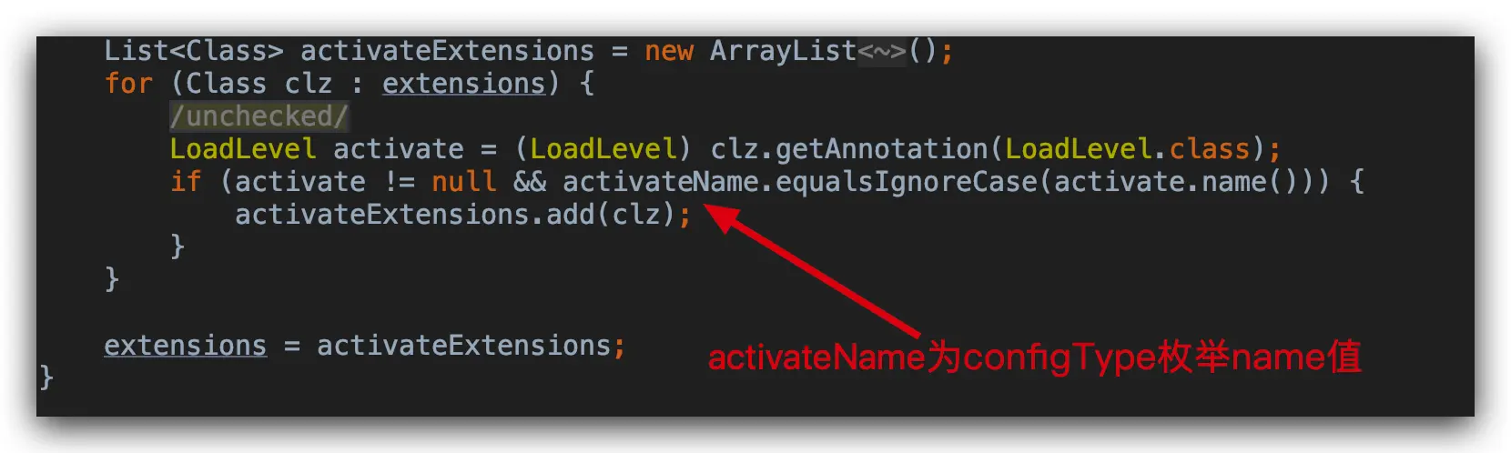 根据当前 configType 来判断是否等于 LoadLevel 的 name 属性,如果相等,那么就是当前配置的第三方配置中心实现类。