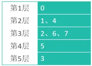 假设现在是一起点为0开始广度优先搜索,0能直接访问到的顶点是1和4,所以1和4在第二层,第二层能直接访问到的是2,6,7,所以2,6,7在第三层,以第三层顶点向下访问,能访问到的顶点只有5,所以5在第四层,最终以第四层向下访问的顶点是3,所以3在第五层。所以每一层元素如下