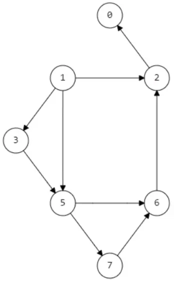 另外还有一些注意点需要注意,例如上图的有向图,从不同节点出发,最终遍历的结果是不一样的,假设现在以7为起点进行广度优先搜索的话, 最终只能访问到顶点7,其余顶点都无法访问,所以在选在遍历起点时,也需要特别的注意。而且还有可能存在某些节点,永远无法遍历的情况,例如如下的有向图