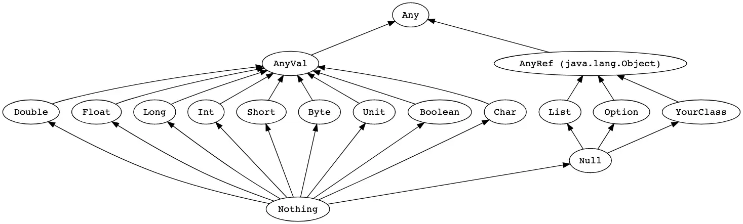 在Scala中,是没有java里面那些基础类型的,所有的Scala类型我们都可以称之为type,下面是一个类型层次结构的子集: