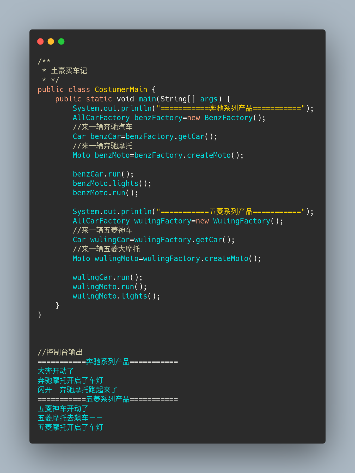 紧接着上一章的工厂方法模式,其实抽象工厂的概念和工厂方法的概念都是差不多的,抽象工厂模式是对工厂方法模式的更高级,比如上次我们说的那个汽车工厂总部类AllCarFactory,本来他只定义了生产汽车这个方法,下面的各个品牌的汽车厂也只能生产这个汽车,现在由于市场需求,需要生产摩托车,然后AllCarFactory定义了一个生产摩托车的接口,这样这个接口下面的汽车厂就可以生产摩托车了.就在这时他们的生产模式也从工厂方法模式升级到了抽象工厂模式;
