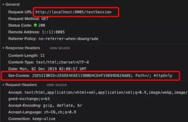 这里我们写一个新的方法来测试Session是如何产生的,我们在请求参数中加上HttpSession session,然后再浏览器中输入http://localhost:8005/testSession进行访问可以看到在服务器的返回头中在Cookie中生成了一个SessionId。然后浏览器记住此SessionId下次访问时可以带着此Id,然后就能根据此Id找到存储在服务端的信息了。