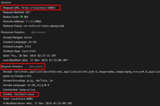 接下来我们换一个请求呢?是不是Cookie也会带过去呢?接下来我们输入路径http://localhost:8005请求。我们可以看到Cookie字段还是被带过去了。