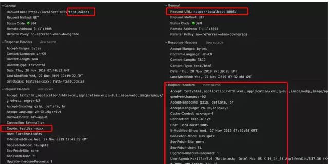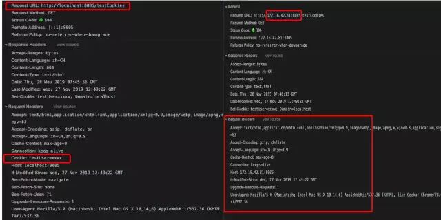 设置为cookie.setDomain("localhost"),接下来我们访问http://localhost:8005/testCookies我们发现下图中左边的是有Cookie的字段的,但是我们访问http://172.16.42.81:8005/testCookies,看下图的右边可以看到没有Cookie的字段了。这就是Domain控制的域名发送Cookie。