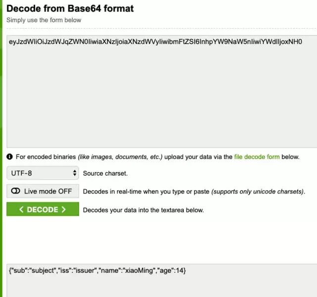 默认情况下JWT是不加密的,任何人只要在网上进行Base64解码就可以读到信息,所以一般不要将秘密信息放在这个部分。这个Json对象也要用Base64URL算法转成字符串