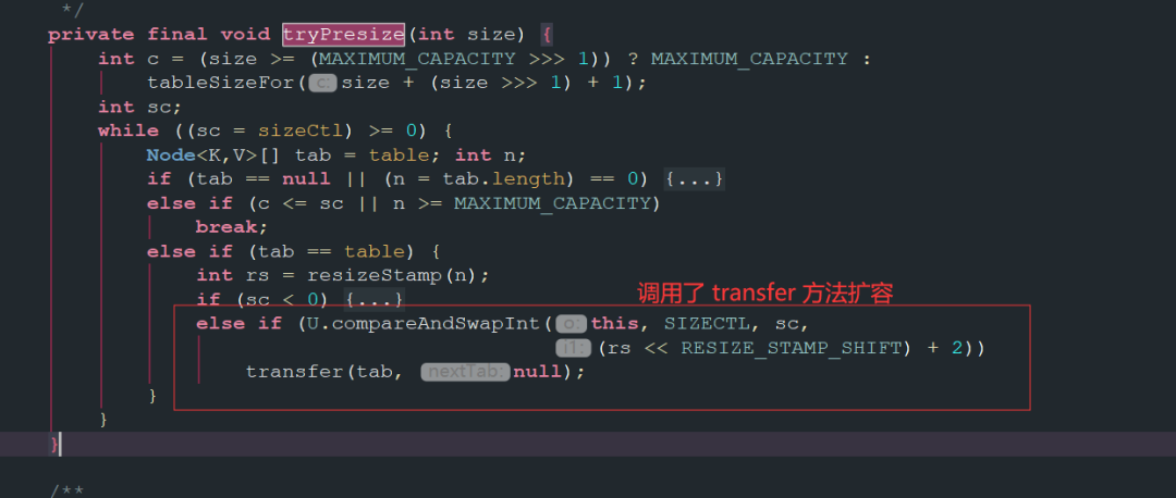 // X传入的是1,check 传入的是 putVal 方法里的 binCount,没有hash冲突的话为0,冲突就会大于1 private final void addCount(long x, int check) { ConcurrentHashMap.CounterCell[] as; long b, s; // 统计ConcurrentHashMap里面节点个数 if ((as = counterCells) != null || !U.compareAndSwapLong(this, BASECOUNT, b = baseCount, s = b + x)) { ConcurrentHashMap.CounterCell a; long v; int m; boolean uncontended = true; if (as == null || (m = as.length - 1) < 0 || (a = as[ThreadLocalRandom.getProbe() & m]) == null || !(uncontended = U.compareAndSwapLong(a, CELLVALUE, v = a.value, v + x))) { fullAddCount(x, uncontended); return; } if (check <= 1) return; s = sumCount(); } // check就是binCount,binCount 最小都为0,所以这个条件一定会为true if (check >= 0) { ConcurrentHashMap.Node<K,V>[] tab, nt; int n, sc; // 这儿是自旋,需同时满足下面的条件 // 1. 第一个条件是map.size 大于 sizeCtl,也就是说需要扩容 // 2. 第二个条件是`table`不为null // 3. 第三个条件是`table`的长度不能超过最大容量 while (s >= (long)(sc = sizeCtl) && (tab = table) != null && (n = tab.length) < MAXIMUM_CAPACITY) { int rs = resizeStamp(n); // 该判断表示已经有线程在进行扩容操作了 if (sc < 0) { if ((sc >>> RESIZE_STAMP_SHIFT) != rs || sc == rs + 1 || sc == rs + MAX_RESIZERS || (nt = nextTable) == null || transferIndex <= 0) break; // 如果可以帮助扩容,那么将 sc 加 1. 表示多了一个线程在帮助扩容 if (U.compareAndSwapInt(this, SIZECTL, sc, sc + 1)) transfer(tab, nt); } // 如果不在扩容,将 sc 更新:标识符左移 16 位 然后 + 2. 也就是变成一个负数。高 16 位是标识符,低 16 位初始是 2 else if (U.compareAndSwapInt(this, SIZECTL, sc, (rs << RESIZE_STAMP_SHIFT) + 2)) transfer(tab, null); s = sumCount(); } }