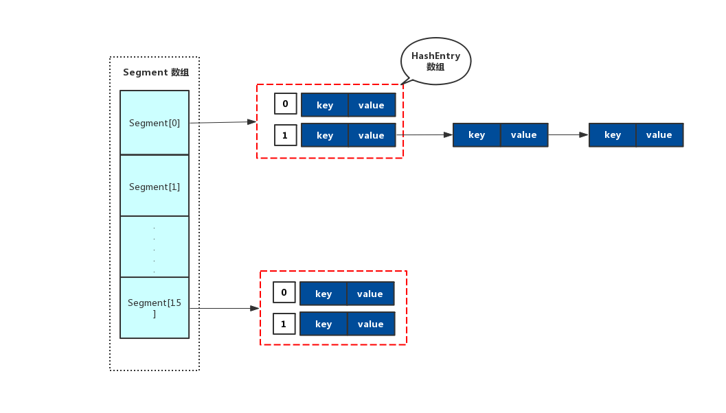 Segment 对象继承了 ReentrantLock 类,因为 Segment 对象它就变成了一把锁,这样就可以保证数据的安全。 在 Segment 对象中通过 HashEntry 数组来维护其内部的 hash 表。每个 HashEntry 就代表了 map 中的一个 K-V,如果发生 hash 冲突时,在该位置就会形成链表。